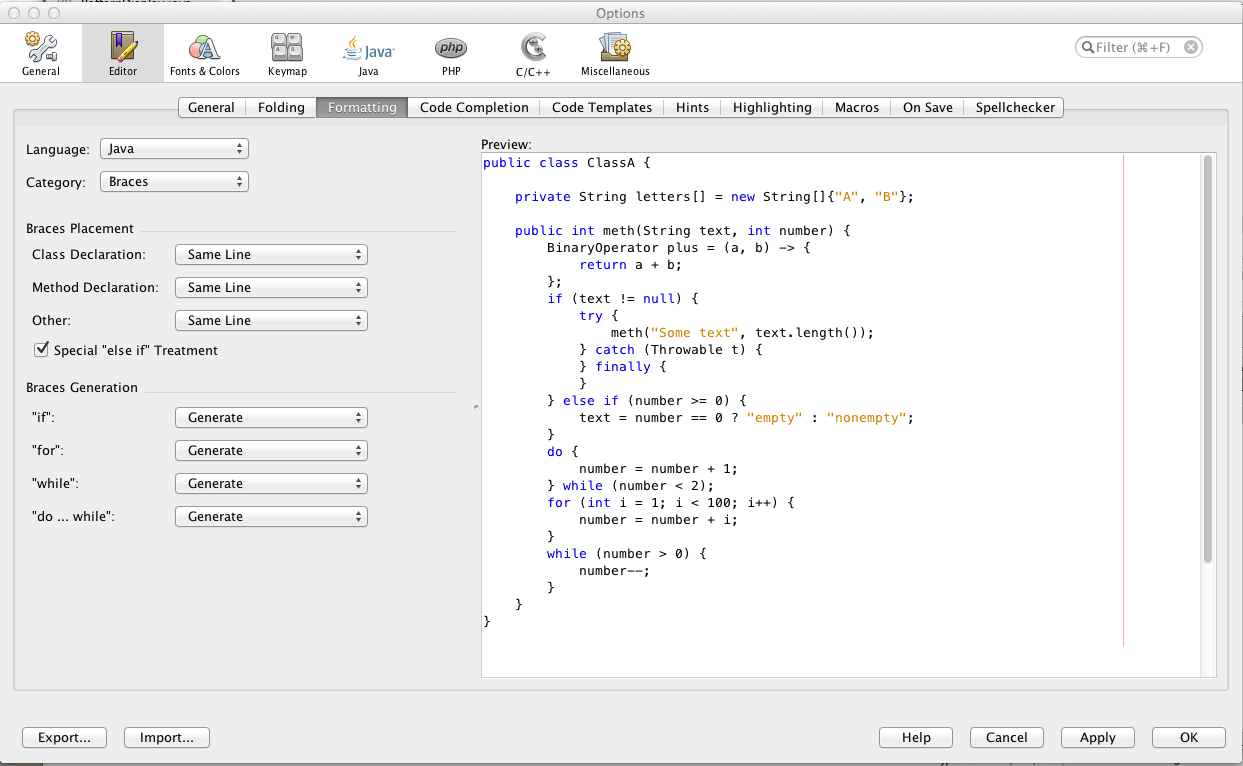 Braces are one of those topics which result in heated debate between programmers. Netbeans lets you choose when braces appear and if they appear on a new line. It also lets you choose whether to have a merged else if or separate out.