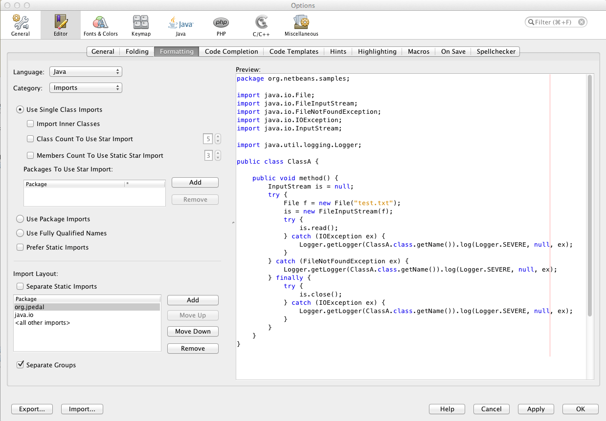 You can also define the order of the imports and it can include any Java class. In my example, I want our PDF classes first, then java.io, and then any other entries.