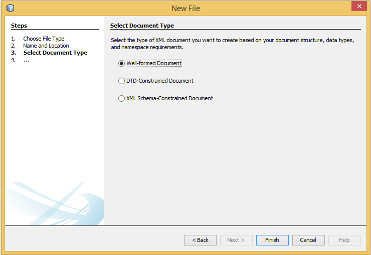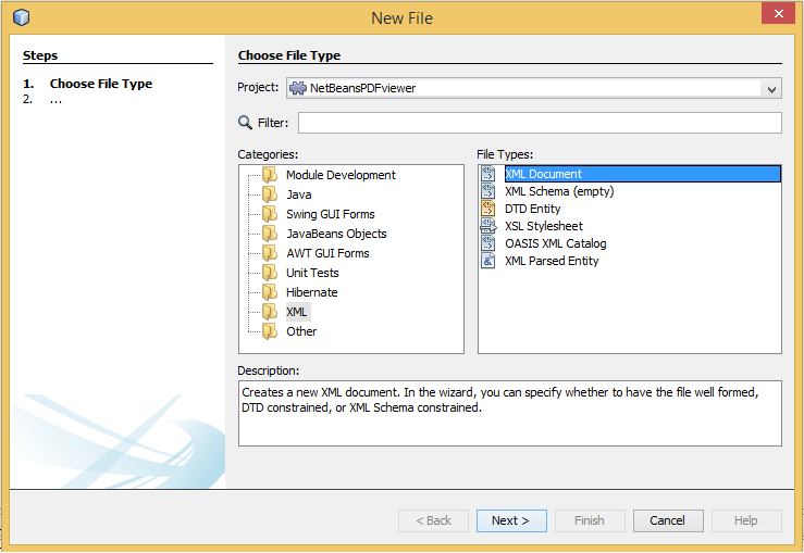 If XML Document isn’t displayed select Other -> than select XML option from the left window -> and XML Document option from the right window.