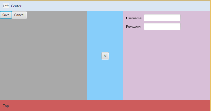 BorderPane splits the scene in five regions such as: top, bottom, left, right, and center. Where you can adjust added nodes. BorderPane also allows you to add different panes in each region as shown in my example. However you cannot use the same pane more than once.