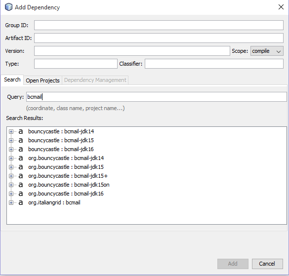 The project will still have errors though as we need to fix jdeli, which requires many external jars. I will give you one example so that you will know how this works and add the rest without documenting them. First right-click on your jdeli’s Dependencies folder in Project view and select Add Dependency. Now we are going to search for the jar we need – bcmail. NetBeans links up with the Maven repository and carries out the search and retrieve steps for you.