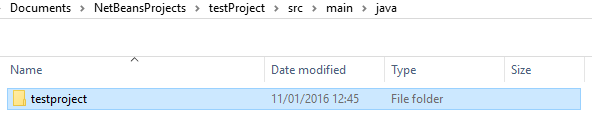 First we want to keep our current NetBeans configuration files but we don’t want to delete or move them, so we are just going to rename them so NetBeans won’t recognize them. Before renaming I would recommend closing the project in NetBeans and closing NetBeans. Leaving either open might create the files again once you rename them. I have attached my file structure below for testProject. You need to rename your nbproject folder and files manifest.mf and build.xml. You don’t technically need to rename manifest.mf because both Ant and Maven use this. Maven will create it’s own if it is needed so rename your current one as you can use it if you ever want to switch back to Ant.