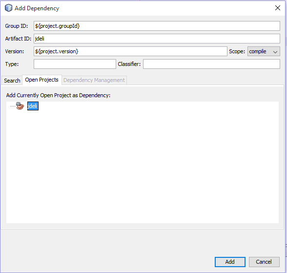Lets fix testProject first. To do this we need to add a dependency for a local project. Right-click on your testProject’s Dependencies folder in Project view and select Add Dependency. This will open a new window. From there select the Open Projects tab. Here you will see a list of your open projects. Select Jdeli and Add it. Simple and easy.