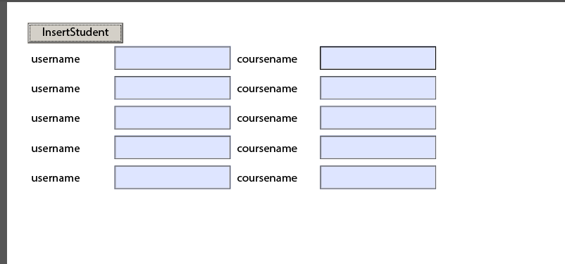 Insert two fields to student subform and name as username , coursename.