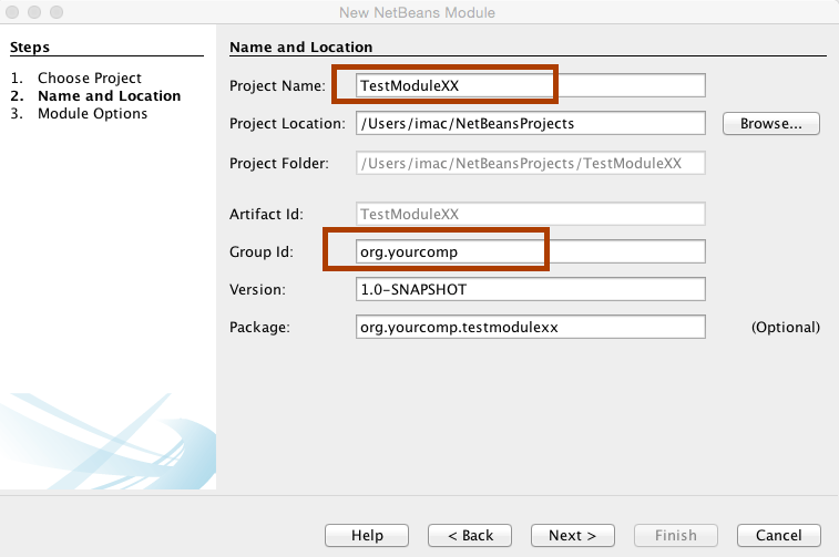 First of make a zip copy of your Ant project so you can always go revert back. In NetBeans, lets create a new Maven Plugin Module, this time i will call it TestMavenXX change the Group ID to the code base name of your Ant Plugin and click next and Finish.