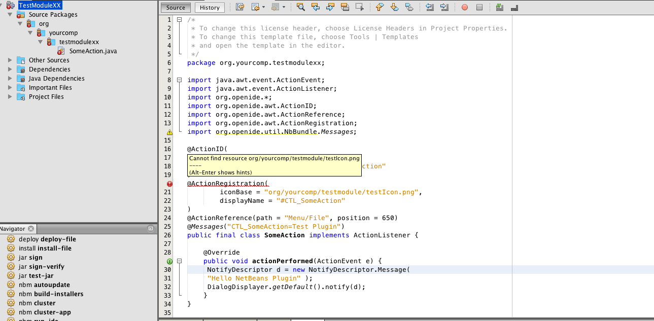 For this tutorial, I will create a simple NetBeans plugin with an Action that pop’s up a ‘Hello NetBeans Plugin’ when clicked.