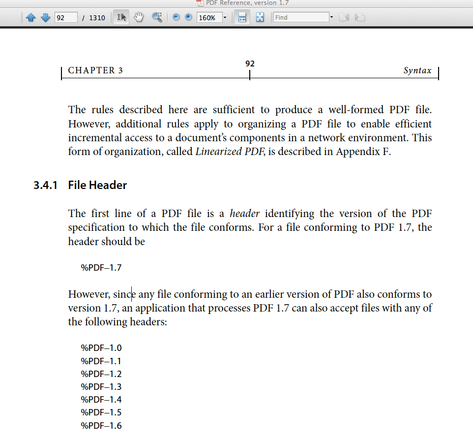 Even though this was part of the spec, this implementation note was specifically about Adobe Acrobat and Reader, and no other PDF processor was obligated to implement the same behavior. However, as you’ve seen, there are PDF files out there that will have “stuff” before the PDF header, and it’s not a bad idea to try to find the PDF header in the first 1024 bytes and do as Acrobat does. You have to adjust your file offsets to make the XRef table work, but that’s just simple math 🙂