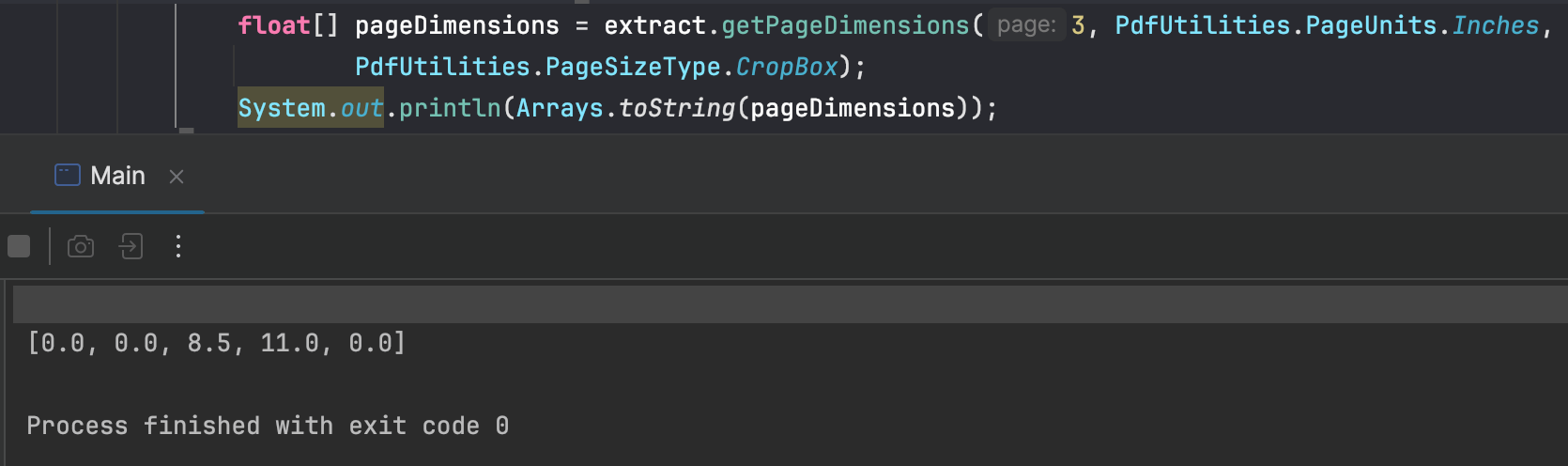 You can try print out the result to see if it’s working: (getPageDimensions returns a float[] with 5 values:- x,y,w,h, pageRotation)