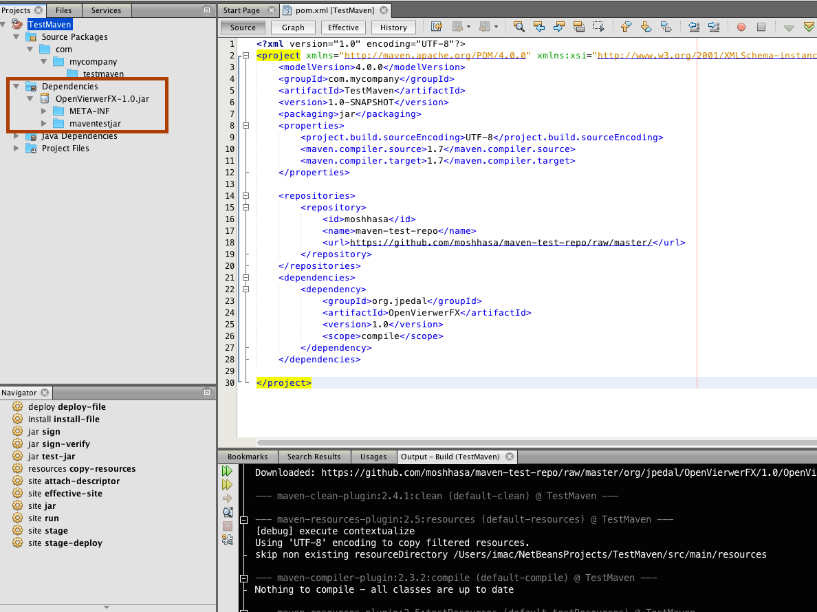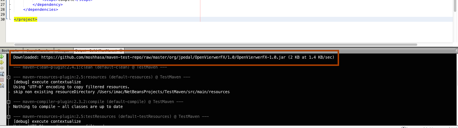 Now save the Pom file and do a Clean and Build on your project. You should see Maven downloading your artifact from GitHub.This will me saved in your local repository.
