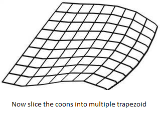 Once the corner points and control points are identified, each bezier curves need to be split into equal t intervals. In theory we are splitting a coons into several trapezoids shaped coons.
