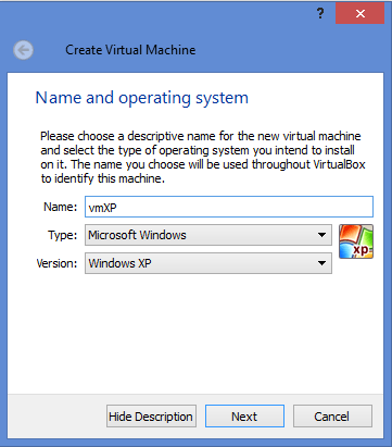 - Enter a name for your Virtual Machine, e.g vmXP.