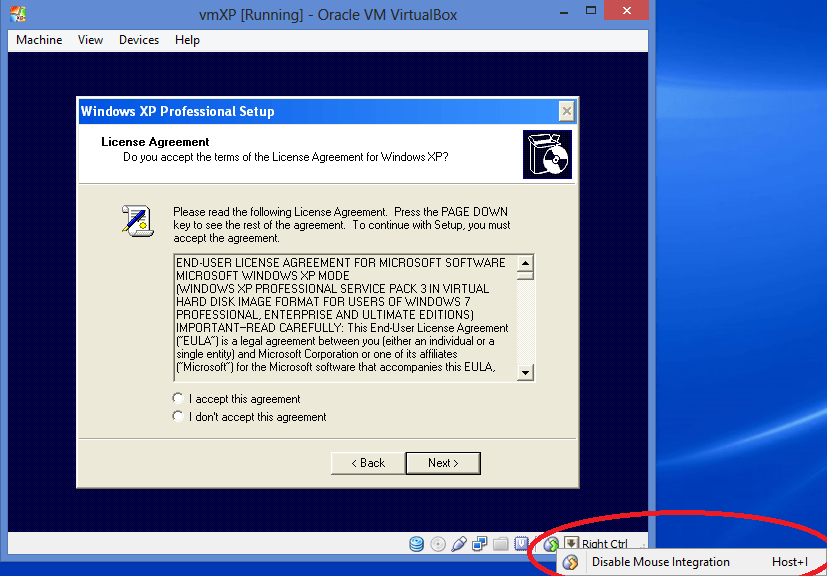 - Windows XP will now start-up in your virtual machine, you may find your mouse won’t move within the virtual machine. If you have this problem, disable mouse integration.