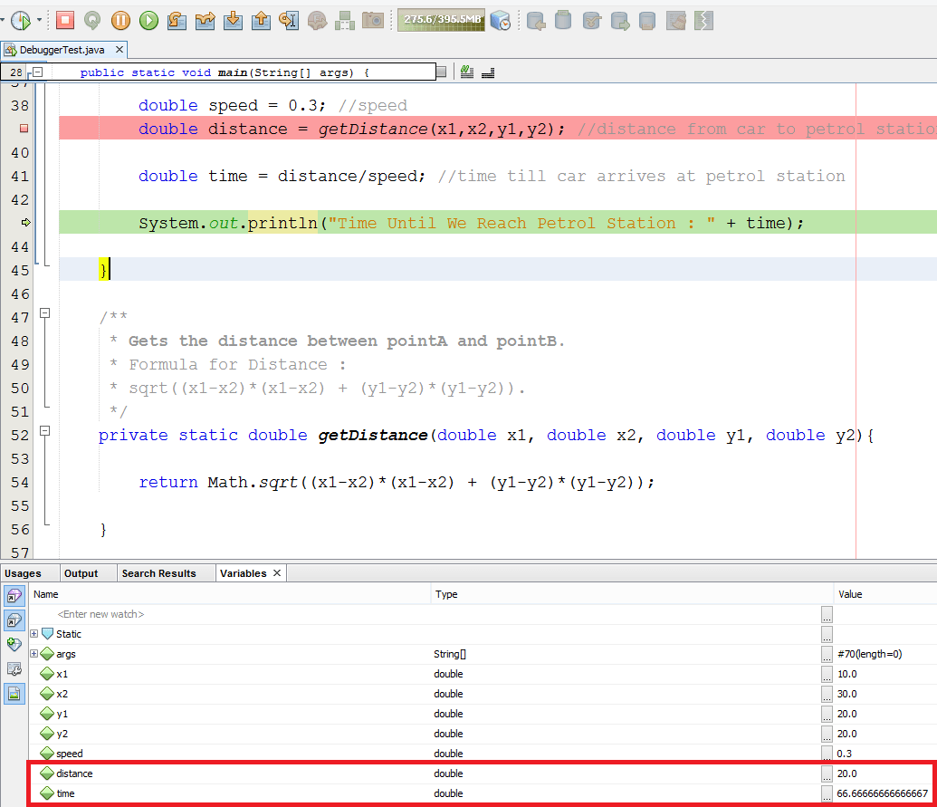 As we can see, distance is 0.0, when it should be a number greater than 0 unless our car is on top of the petrol station. So we’ve found the bug, the formula was wrong and it was causing an incorrect return value for our distance variable.