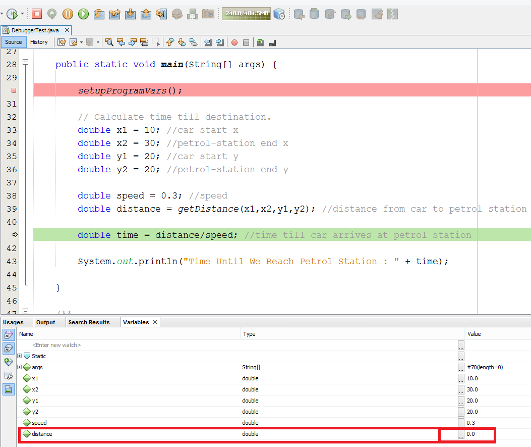 We have potentially found a bug, but we want to know whether it’s the right one. Wwe are going to use the Variables window (can be turned on via menu Window > Debugging > Variables) to see what the value of distance is after we have assigned it a return value from this method.