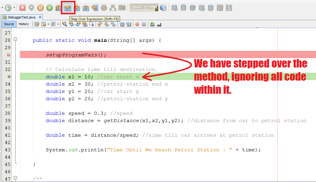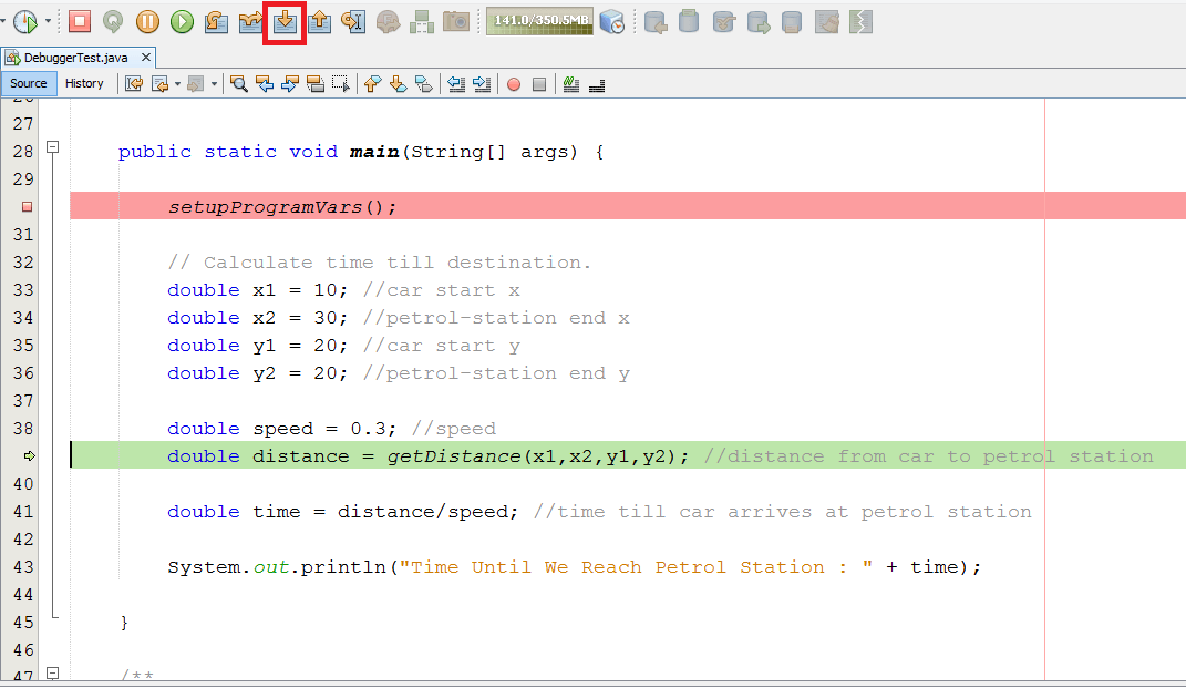 From stepping into each variable we can see that each one we have stepped into has a hard-coded value which seems to be correct. However our distance variable is being assigned a returned value from a method… So it’s possible the returned value is wrong…