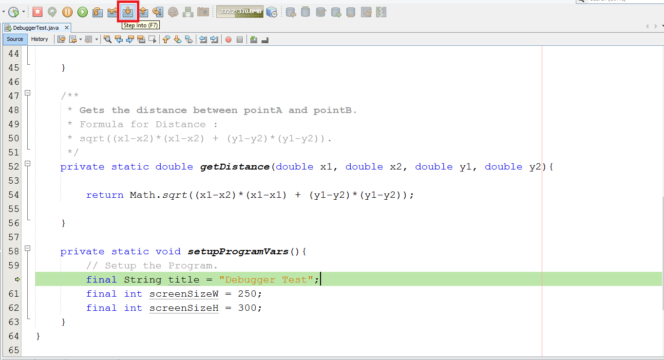 Now that we have run our debugger and it has paused at the line of code where we set our break-point, we can step into the code and see what’s going on. Stepping into the code allows you to read every-line of code in the order that your program is executing from where you set your break point. So let’s press the Step Into button and see where it takes us…