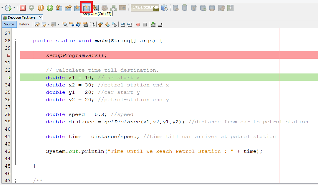 Press the step out button as illustrated in the picture, it should jump us out of the setupProgramVars() method and onto the next line of code. Things are starting to look a little more interesting now, we’re starting to step through relevant values, one of which could potentially be the bug.