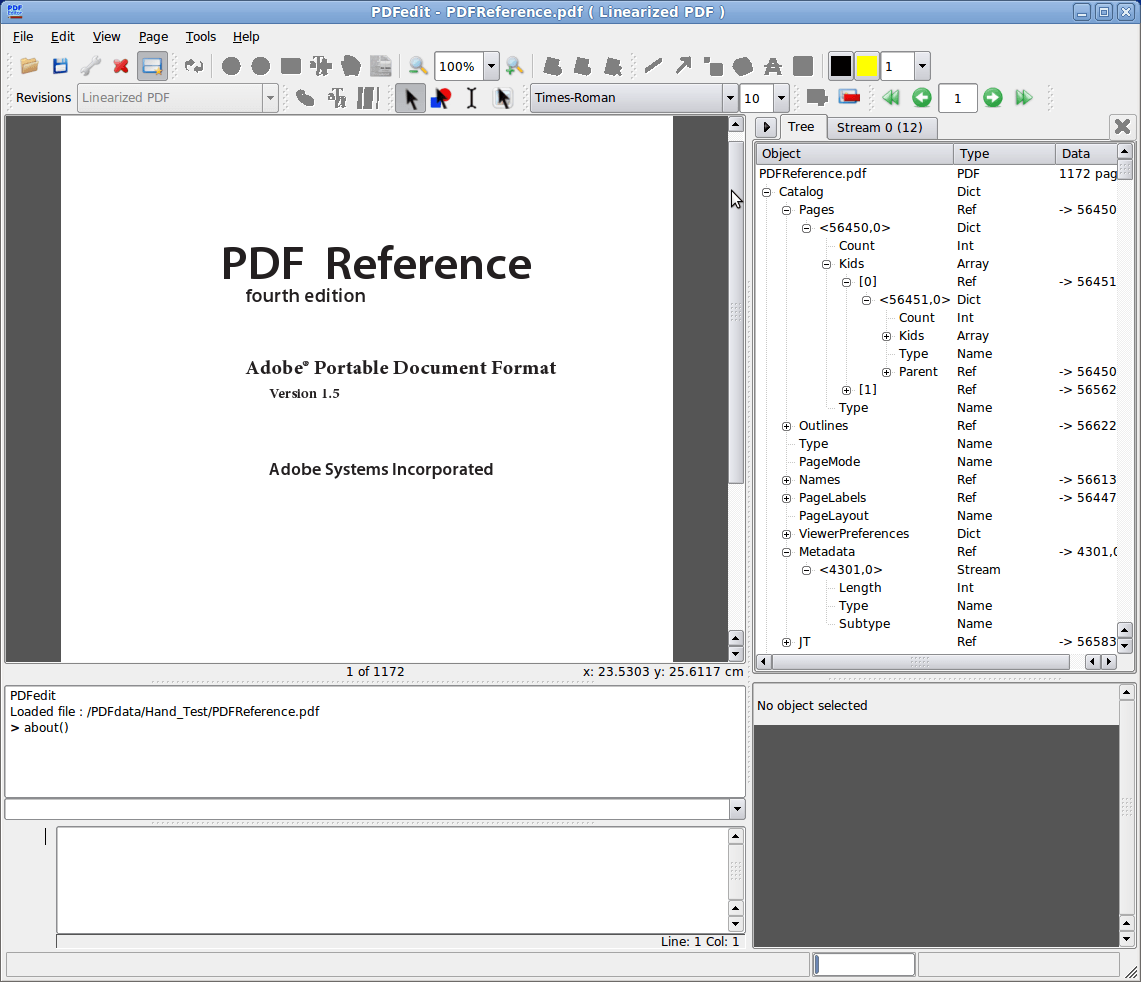 Pdfedit offers a multipane pane display showing the PDF, the internal PDF tree and can also show command streams and other data. Not only does it allow you to see the internals of the PDF file, but it also lets you perform some editing functions including delinearize, flatten, export and add text and images to a page. It seems to cope well with most files – it is based on xpdf which is a mature and tested PDF library.