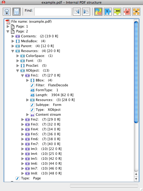 Here is what you might see in the Object tree (shown in Acrobat for a Form). Note it has a content stream of commands (which I have not shown).