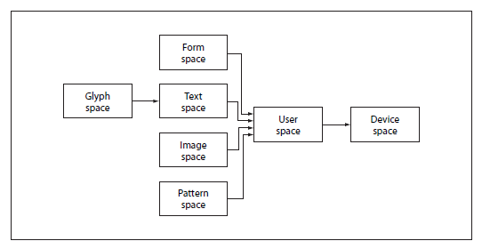 Device Space is the space in which the content of the PDF ultimately ends up. This could be on a range of devices, for example, a monitor or printer. The problem with outputting to these devices is that one particular device’s coordinate system can vary greatly from another, and this means that the image you see on your monitor as 8 inches tall could end up 1 inch tall when output through a printer.