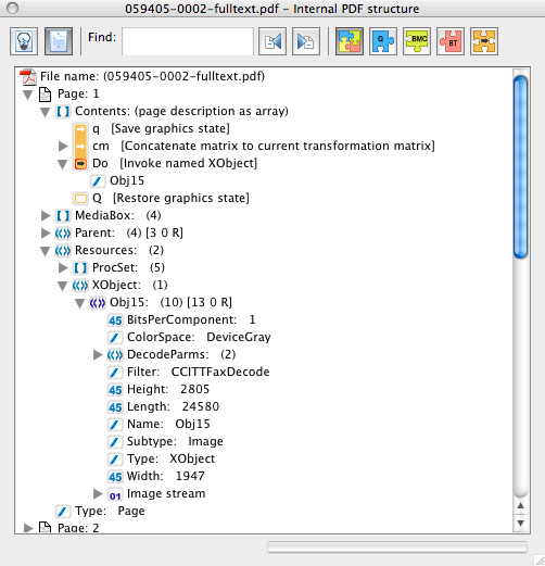 Closer inspection shows that the pages are composed of a single large image. Looking at the page data in Acrobat 9.0 you can see the image details.
